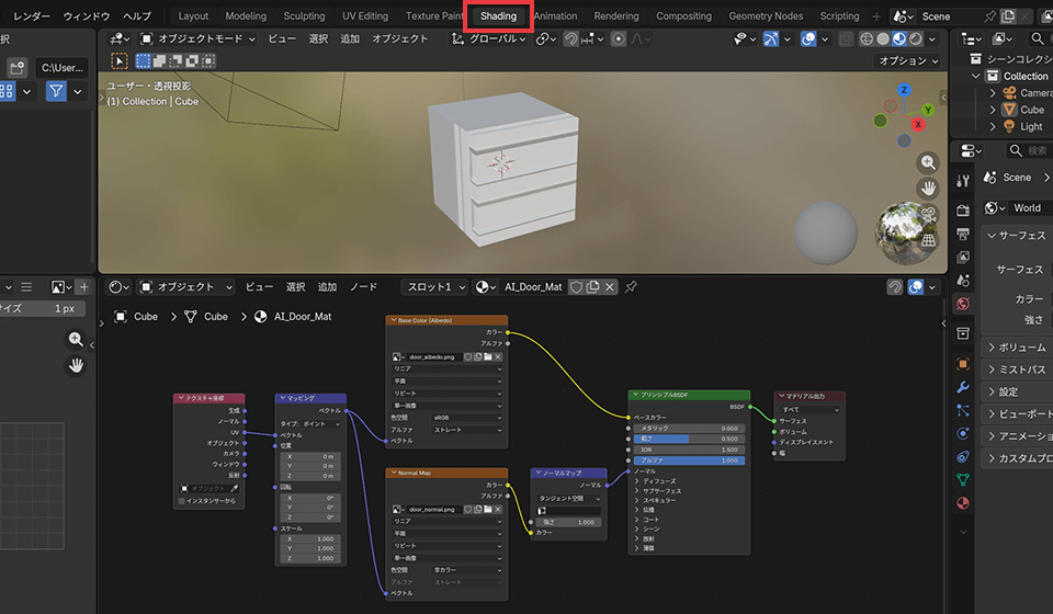 ノードが自動で組まれて、テクスチャも貼られた状態になっていれば成功です。