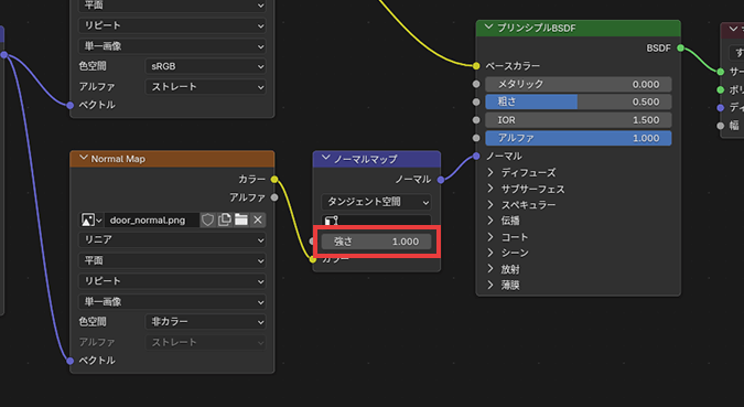 凹凸感を強くしたい場合は、「ノーマルマップ」ノードの「強さ」を上げます。